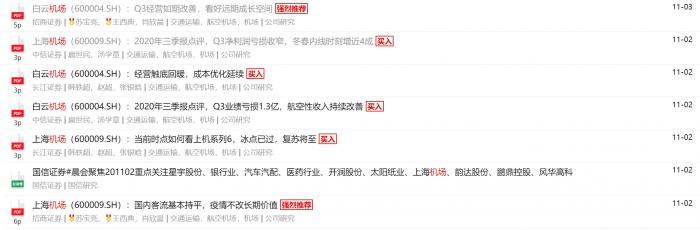 根据不完全统计,仅在wind上10月以来,各券商发布了37篇与机场板块/个股相关的报告,并且有两篇标识强烈推荐(分析师预测未来半年公司股价有20%以上的涨幅),分别为招商证券撰写的白云机场及上海机场报告。