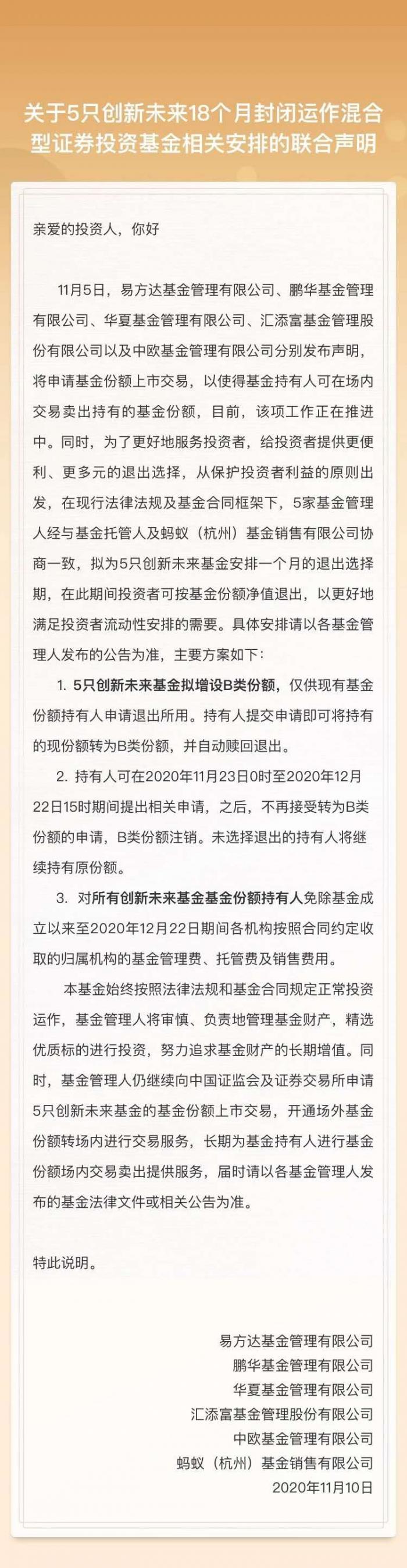 11月10日,5只创新未来基金发布联合声明,投资者可以按基金份额净值退出。