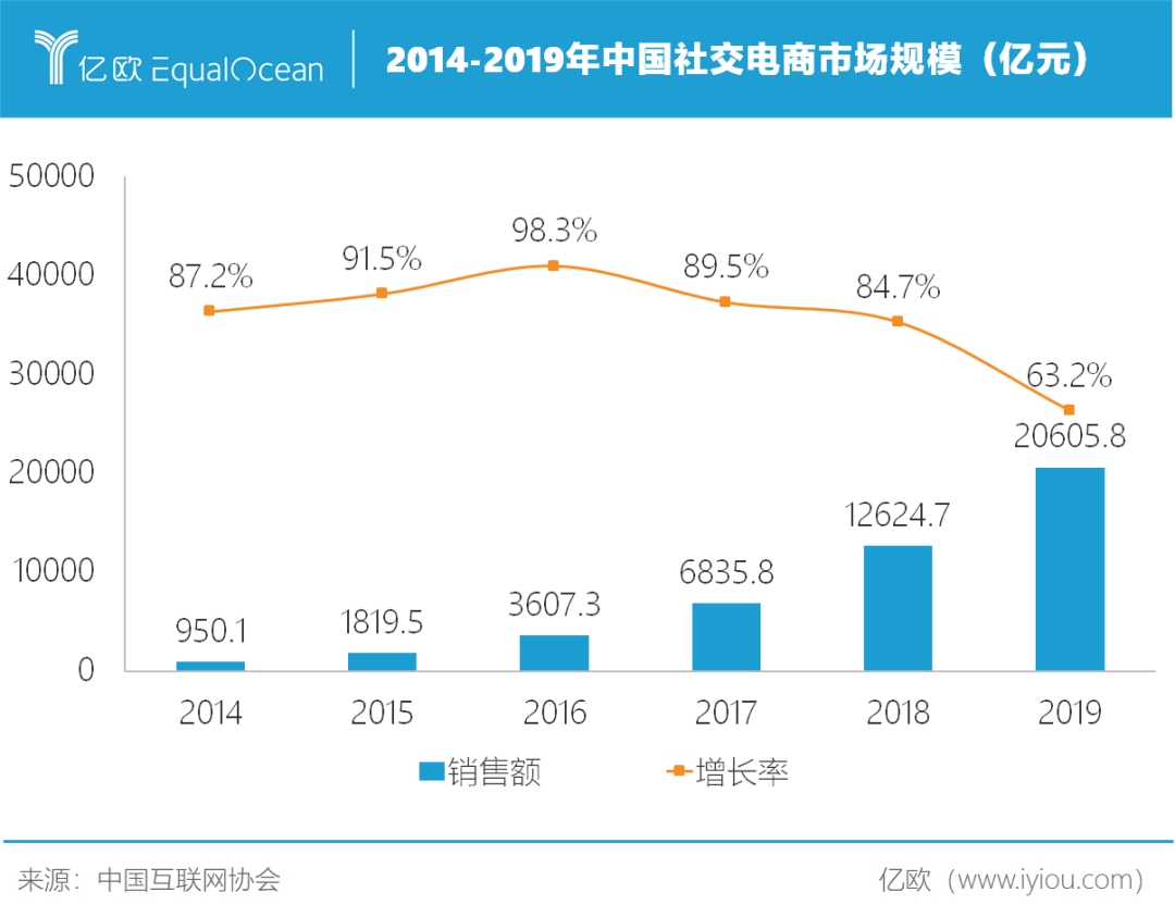 社交电商的蓝海,为美团布局社交打开了一个极佳切入口。据中国互联网协会统计,中国社交电商市场规模在逐年增长,并于2018年突破1万亿元大关。