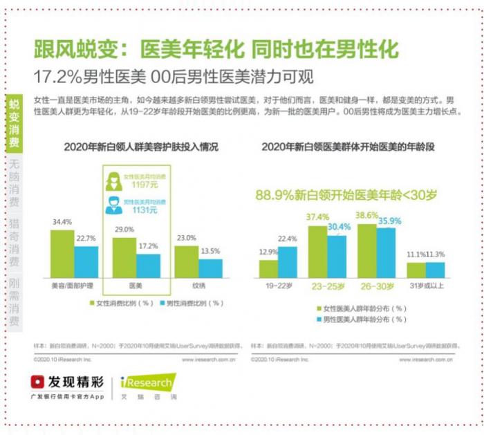 根据天猫最新公布的战报,今年双11期间,平台录得医美医疗订单量环比增长近7倍,成为最受欢迎的生活服务项目,平均客单价达6300元。值得关注的是,其中有近3成订单来自男性消费者。《2020年新白领消费行为研究报告》同样印证了这一点,医美成为疫情后唯一不降反增的消费支出,且有着明显的年轻化、男性化趋势。