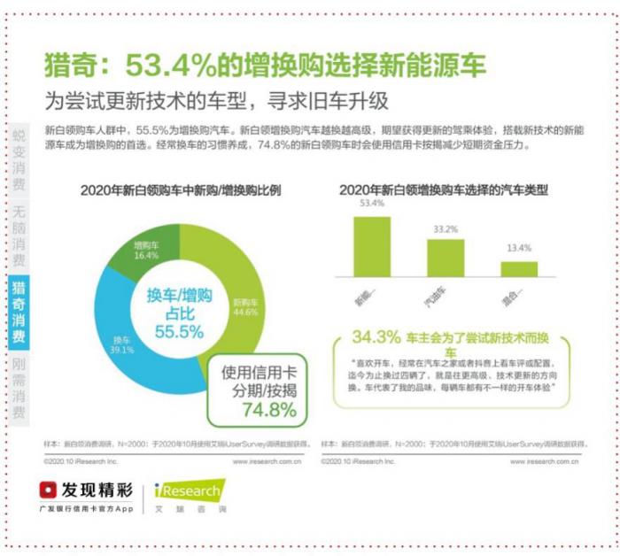 报告中采访的来自武汉的李雷(化名)就是一位典型的“冲动猎奇型”新白领。即便是在汽车这一低频消费领域,他也会因为享受新车、新技术的操控感和体验感而愿意“冲动”消费。李雷从开始买车到现在已经换了3、4辆,并认为男人喜欢车就和女人喜欢买口红包包一样,而且非常渴望跟上朋友换车的速度。