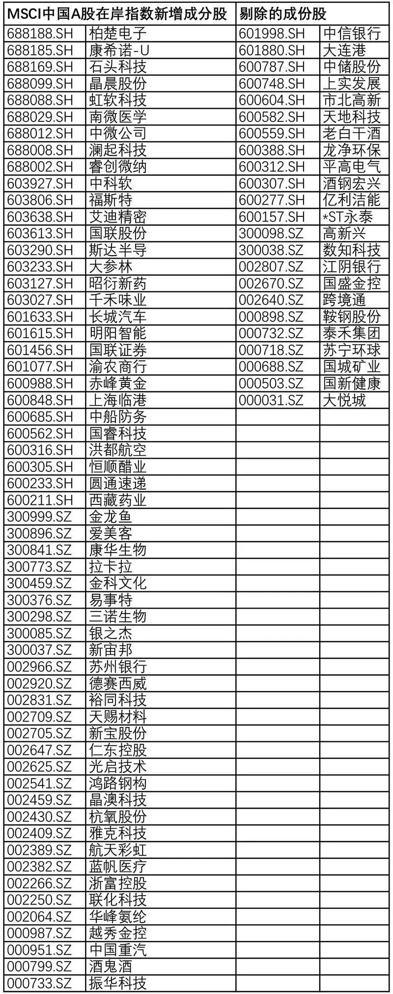 MSCI半年度评审结果公布,本次调整结果将于2020年11月30日收盘后生效。具体来看,MSCI全球标准指数新增141只个股,剔除135只个股。MSCI中国A股在岸指数增加成份股58只,剔除23只标的。