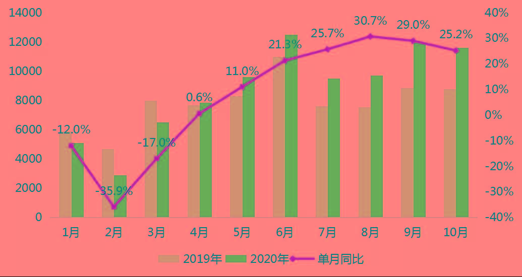 图1:2020年1-10月百强房企单月销售操盘金额及同比变动(亿元)