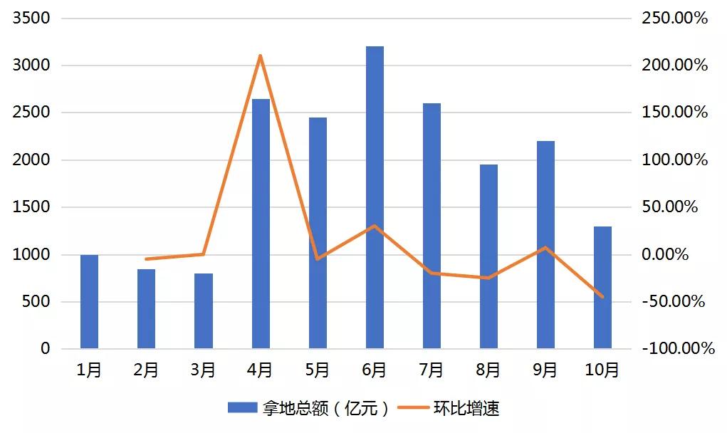 1-10月超过半数房企拿地积极性高于上年,但10月房企拿地规模下滑显著。50家代表房企1-10月月均拿地均值为1907亿元,显著高于2019年月均水平。其中,33家房企2020年前10月月均拿地金额高于2019年月均值。具体来看,一季度,部分城市土地交易市场受疫情影响暂停或放缓推地,50家代表房企拿地规模处在较低水平;进入二季度,商品房交易市场信心逐渐恢复,各地优质地块推出量增加、企业资金面有所改善,多重因素影响下50家代表房企加大投资力度,5月经历短暂回调后6月回升至上半年最高点。经历二季度的积极补仓后,三季度房企调整拿地节奏,拿地规模整体低于上季度。10月房企拿地节奏再放缓,规模下滑明显。50家代表房企中,39家10月拿地金额较前9个月均值出现下滑,这一比例较上个月有明显增加(数据来源:中指研究院)。