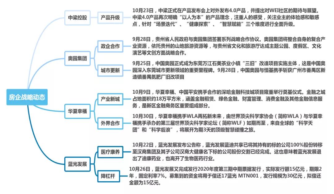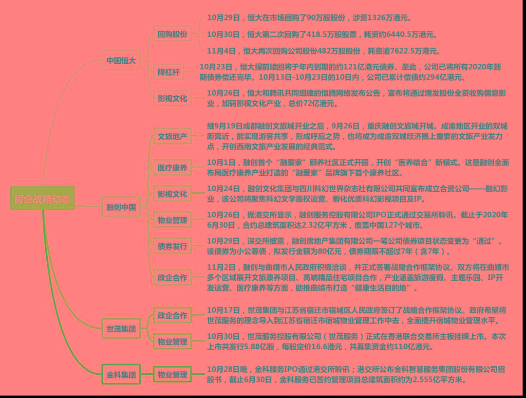 本月房企战略多集中在物业管理和政企合作方面,此外房企还涉足了影视文化及医疗康养等新版块。其中影视文化产业由中国恒大和融创中国同时加码影视产业上游,涉及影视IP创新与创作。医疗康养方面“一进一退”:一边是融创中国开创“医养结合”新模式,全速进军医养健康领域。一边是蓝光发展将迪康药业全部股份交割,离开了生物医药行业。值得特别关注的是,布局物业管理版块愈发成为一种普遍的房企战略趋势。据克而瑞地产研究统计,截至10月30日,上市物企已达34家,本年已有10家物业公司成功上市,另有10家企业已递表排队等待中,其中世茂服务与和合景悠活双双在港交所挂牌交易;融创服务和金科服务已通过上市聆讯,成功上市已板上钉钉。由于物业服务本身具有轻资产运营的特性,营收相对可预测、现金流也较为稳定,得到了资本市场的青睐,预计后续物管行业上市潮仍将继续。