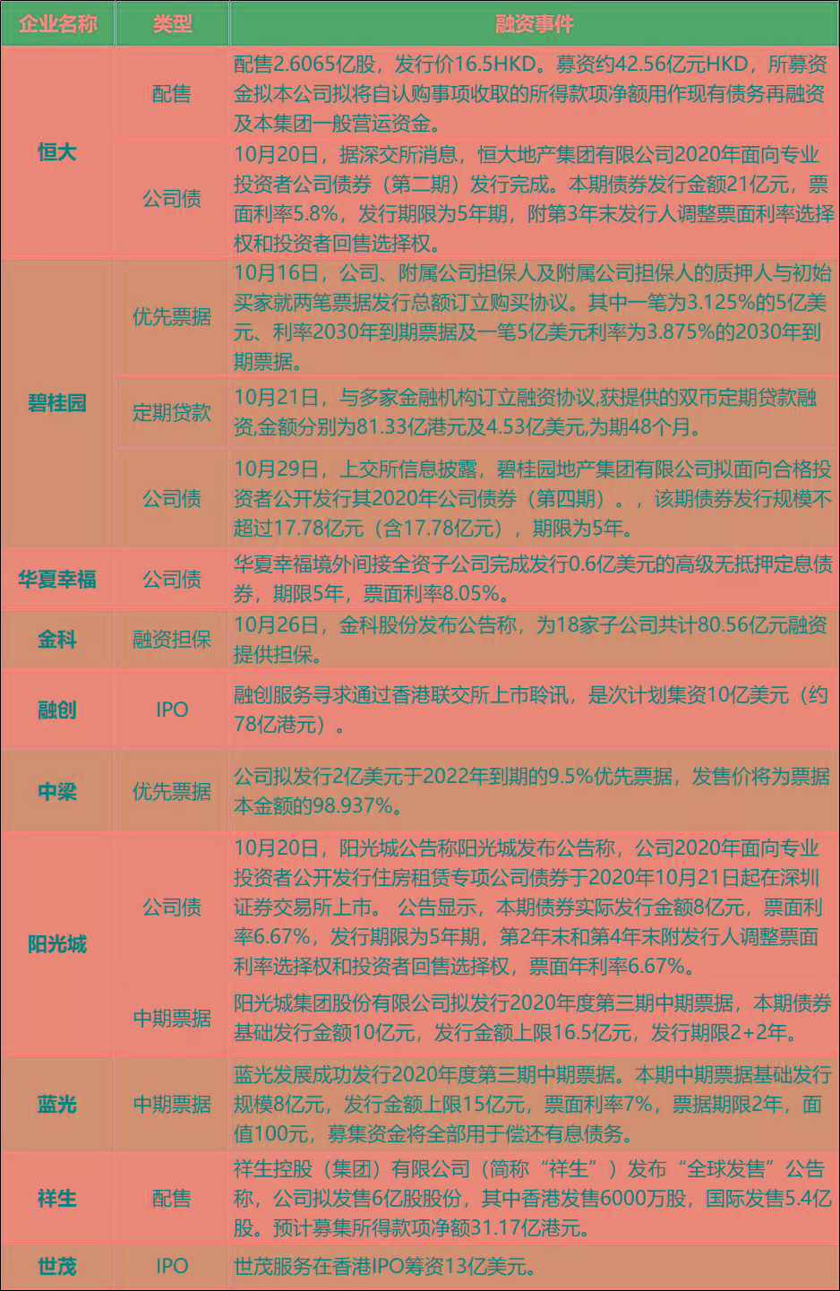 本月融资总量最高的企业为碧桂园,融资总量168.20亿元,主要发行了10亿美元的境外优先票据,以及合计超过100亿元人民币的境外双币定期贷款。此外,阳光城本月发行数额也较大,发行了16.5亿元的中期票据,以及为多家子公司进行担保融资。从企业梯队来看,2020年前10月TOP10房企融资平均额278.8亿元,同比下降9.04%,降幅较上月有所收窄。此外,TOP11-30以及TOP31-50房企融资额均实现同比上涨,TOP11-30的融资成本降幅最大,下降1.50个百分点,此外TOP51+房企降幅也达到了约1.50个百分点,TOP31-50梯队房企成本下降了1.23个百分点(数据来源:克而瑞、Wind)。