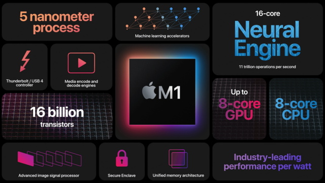 首次以M开头,没有延续iPhone的A系列开头,独立成为Apple Silicon自研芯片的另一个系列;苹果首款采用5纳米制程打造的个人电脑芯片,封装了惊人的160亿个晶体管,其数量为Apple所有芯片之最。