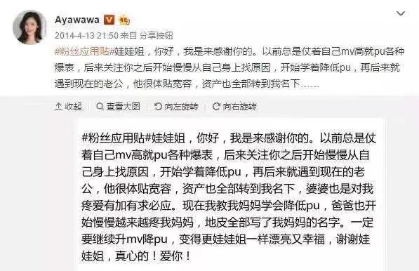 此外,Ayawawa还经常会发表一些大胆、敏感、反科学的言论以博人眼球,2018年5月,Ayawawa喜提微博禁言,而后便在互联网世界中销声匿迹。