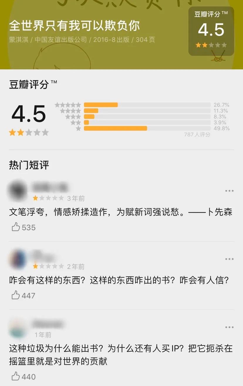 在豆瓣,该书目前的评分为4.5分,近半数的人打了1星。最近几天的书评有凑热闹之嫌,但几年前的书评也几乎是一边倒的差评。高赞的书评中,有读者早在两年前就发出了灵魂三连:「咋会有这样的东西?这样的东西咋出的书?咋会有人信?」