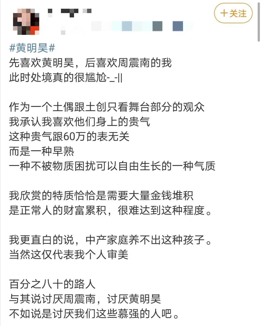 甚至最近被曝出父母是「老赖」的周震南和母亲疑似为「老赖」的黄明昊,也有粉丝在事发后直言不讳,称自己就是喜欢他们身上的「贵气」,喜欢他们身上「不被物质困扰可以自由生长的一种气质」。