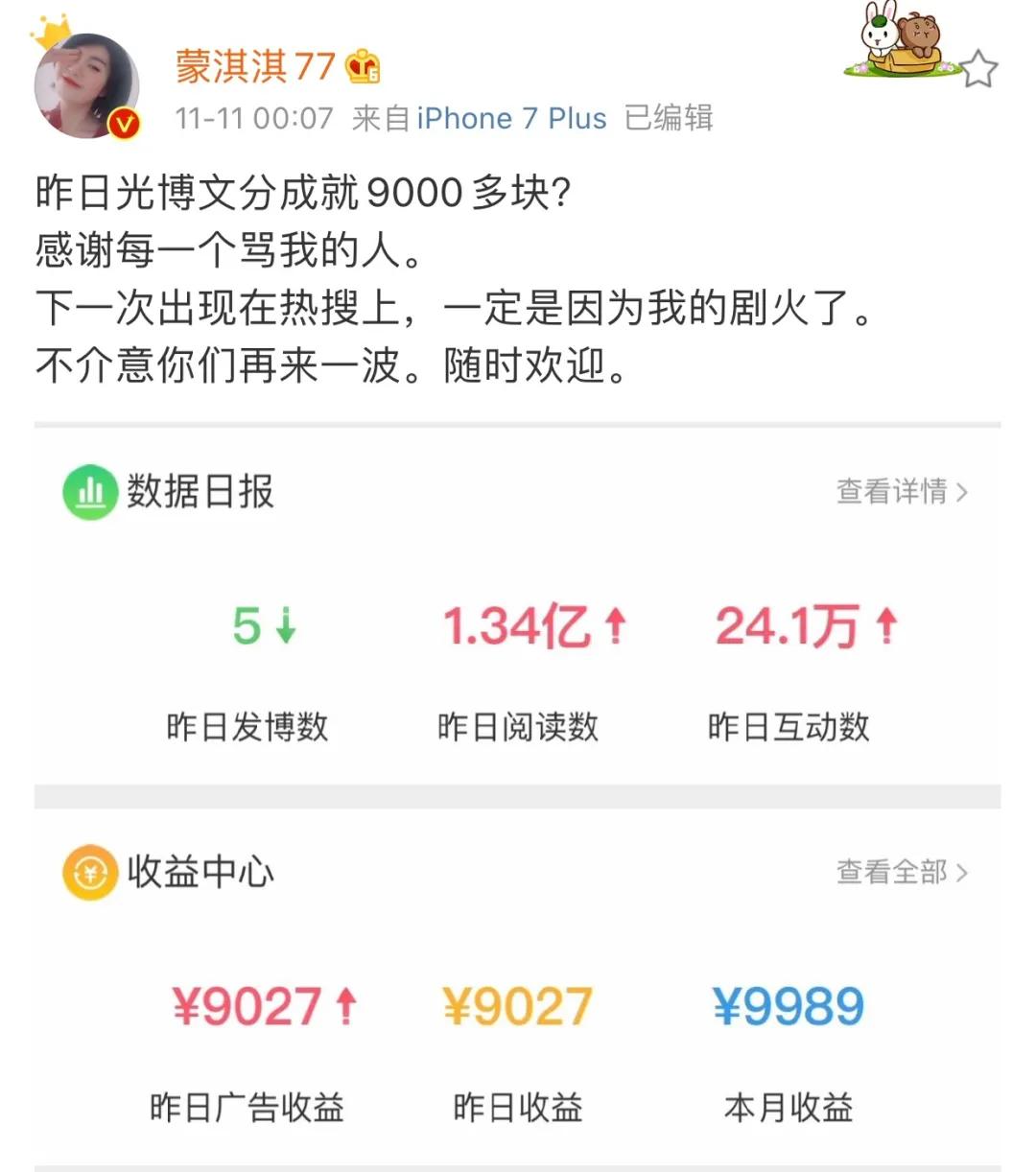 人火了,书的销量却没上去,但蒙淇淇77并不是这场网络狂欢的输家。有流量就有变现,蒙淇淇77趁着热度,接了几条微博广告,仅11月10日一天,就分成9000多元。