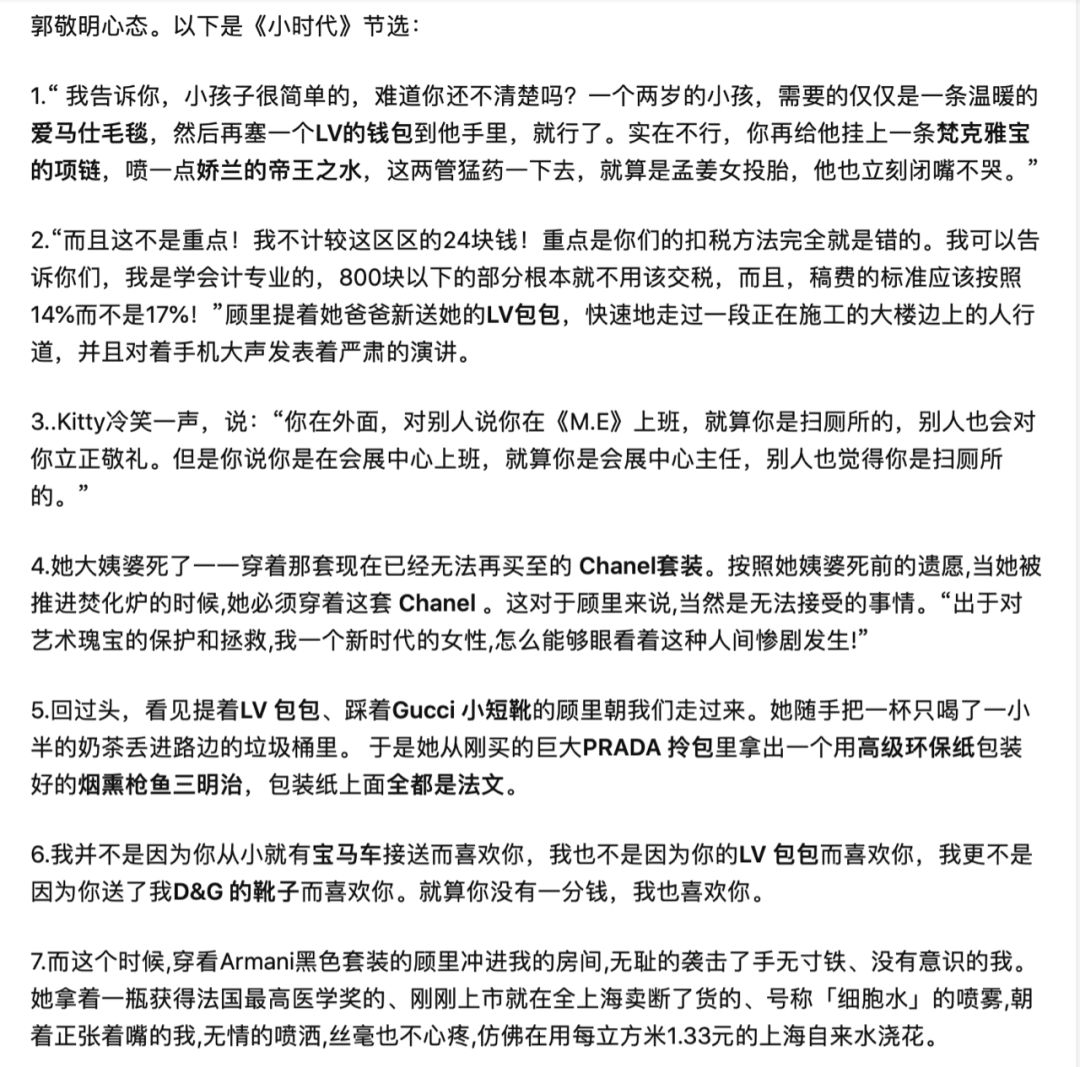备受争议的郭敬明所著的备受争议的小说《小时代》,也被指责「凡尔赛」要素过多,为女性灌输不切实际的华丽幻想。