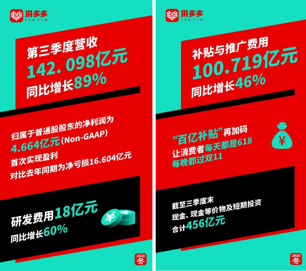营收增长带动下,拼多多实现了上市以来首次季度盈利,非美国通用会计准则(NON-GAAP)下,拼多多三季度归属于普通股股东的净利润为4.7亿元。