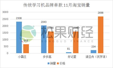 根据图表显示,四家学习机品牌在淘宝店铺中销量最好的单品价格和销量情况,可以看得出图表中小霸王和步步高是传统学习机品牌中销量最好,但两者至今有近三倍的价格差,小霸王的低价策略与步步高相比没有太大的可比性。