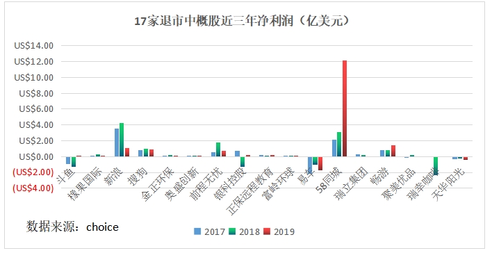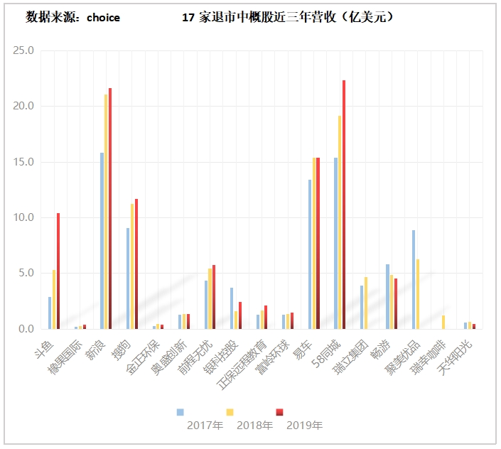 而从财务方面看,退市企业中,有8家中概股近三年营收均有增长,其中尤以斗鱼增收最为明显,从2017年的2.89亿美元增长至2019年的10.44亿美元,年均复合增长约1.9倍。此外,新浪、搜狗、前程无忧、58同城等均有不同程度的增长。