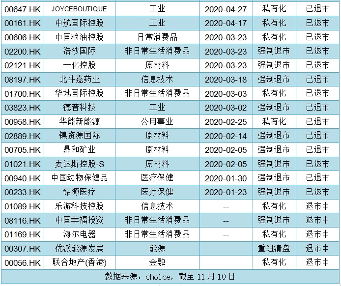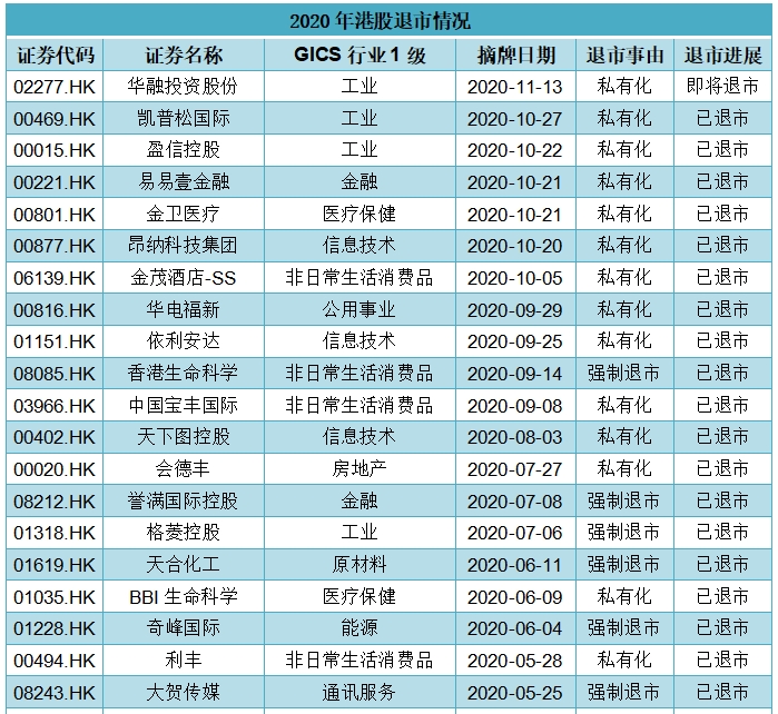 这些已退市企业主要集中在以下行业:非日常生活消费品(6家)、工业(6家)、原材料(5家)、信息技术以及医疗保健(均各为4家)、金融和公用事业(均各为2家),以及房地产、能源、日常消费品和通讯服务行业各1家。以下为2020年港股退市企业全名单(截至11月10日):