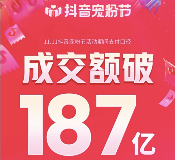 11月12日,抖音电商选择公布双11的成交数据,双11抖音宠粉节(10月25日至11月11日)平台成交额突破187亿元,其中,11月11日当天成交额超20亿元。