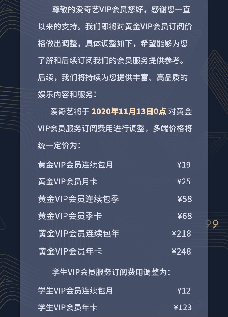 前些天,微博账号爱奇艺VIP会员发布通知称,将在2020年11月13日0点开始,对VIP会员服务订阅费用进行调整,黄金VIP会员连续包月19元,单独购买月卡25元。