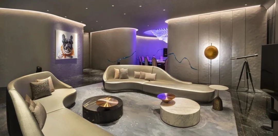 与其他酒店大堂奢华的装饰不一样,W酒店的“潮堂”设计简洁。以蓝紫色为主色调,配合黑色背景,加之简洁线条元素,定位时尚、现代的奢潮酒店形象,与当下创新突破的青年精神呼应。