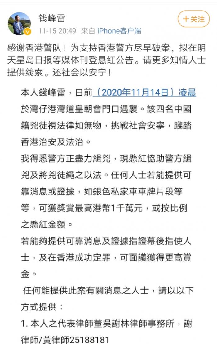 11月14日凌晨,内地富商钱峰雷在香港街头遇袭被砍伤。15日晚间,钱峰雷遇袭后微博首发声,称愿意“悬赏1000万港币协助警方缉拿凶手”。
