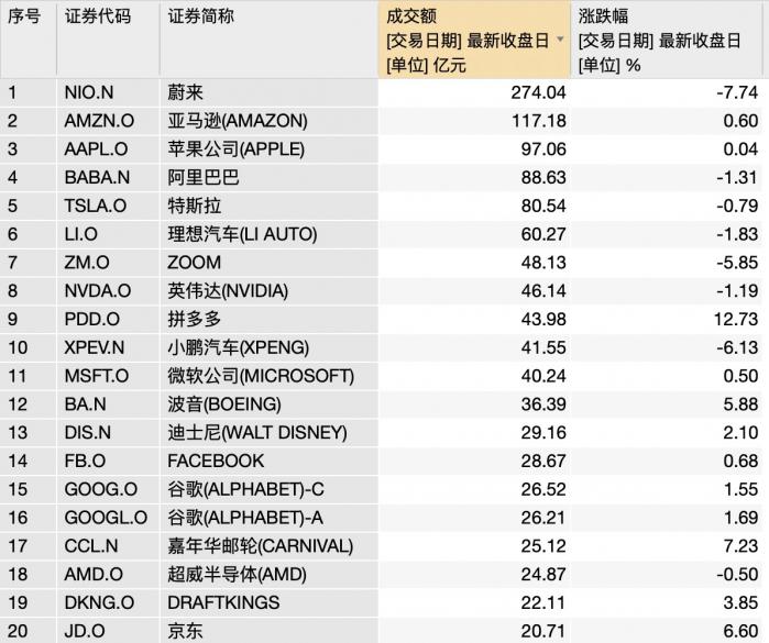 值得注意的是,当日美股出现一个罕见现象,美股成交额前十的股票里面,其中有5个只中概股,包括蔚来(274亿美元)、阿里巴巴(89亿美元)、理想汽车(60亿美元)、拼多多(44亿美元)、小鹏汽车(42亿美元)。