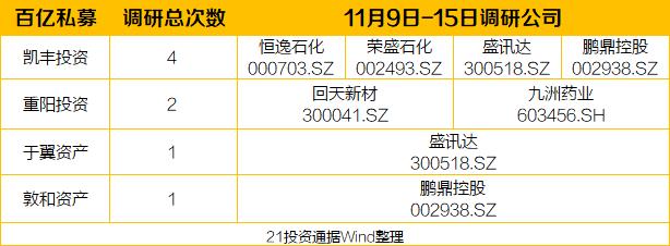 从具体调研机构来看,过去一周,4家百亿私募调研了6只个股。其中凯丰投资最热情,调研了4家公司;鹏鼎控股获凯丰投资、敦和资产2家百亿私募青睐,盛迅达也获凯丰和于翼两家百亿私募调研。