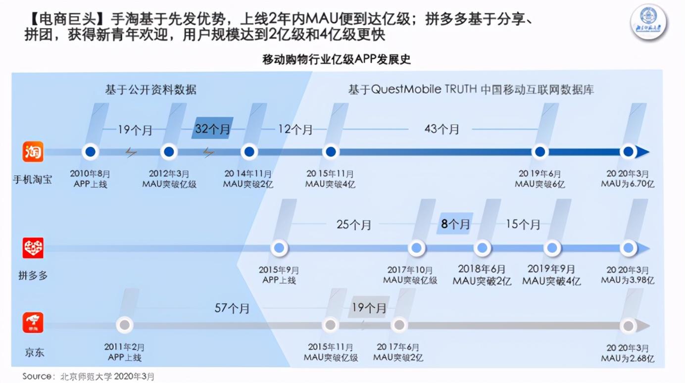 拼多多仅用了不到3年时间,就实现了月活数量从0到2.95亿;在2020年3季度,拼多多App的平均月活用户数更高达6.434亿,较2019年同期增长2.138亿,单季度大涨7,460万。