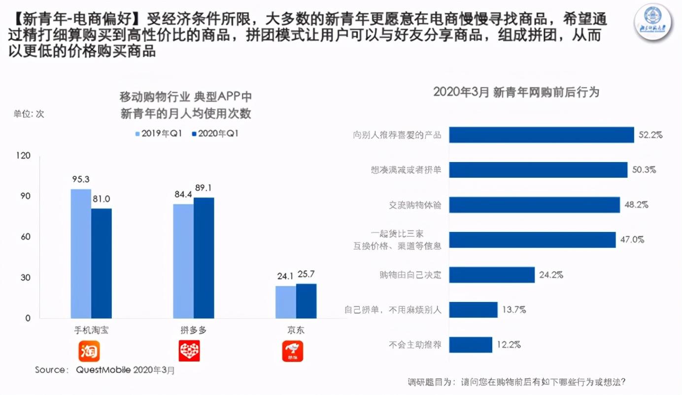 类似地,今年6月份由北师大发布《新青年新消费观察研究报告》也证明了这一点。报告指出,新电商拼多多独创的拼团模式,让用户与好友分享商品并拼团享受低价,这样的新模式受到了年轻用户的欢迎。