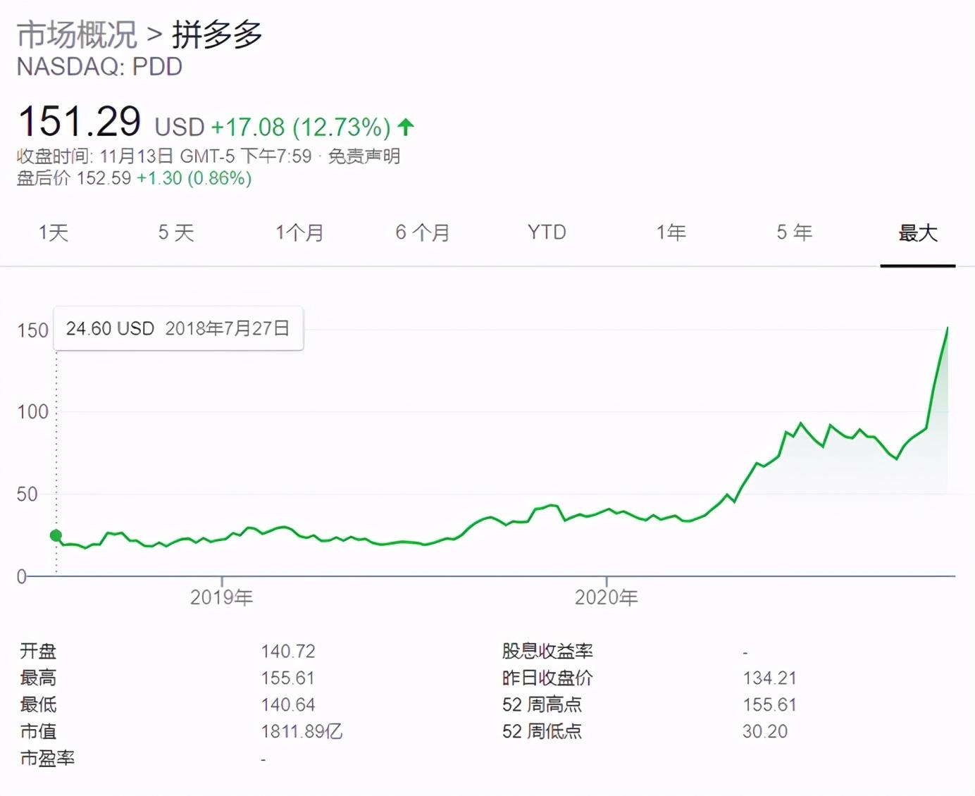 拼多多的高质量增长在资本市场也得到了回报,在过去的52周中,拼多多的股价从最低的30.20美元暴增至最高155.61美元,足足增长5倍。我们不妨来看看,拼多多到底做了什么。