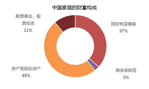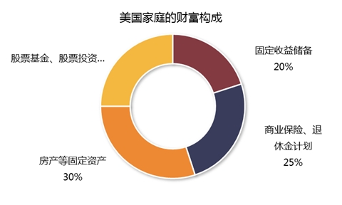 如果说中国人把超过一半的财富放在了房产上,美国人则把一半的财富放在了保障类资产上,包括固定收益储备和保险、退休金计划,这些低风险的投资和房产一起充当了家庭财富的压舱石。