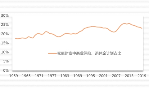 上世纪60年代以来,随着人口老龄化加深,美国家庭持续增加商业保险和退休金计划的配置,以应对医疗、养老和各类意外需求。退休金方面,除了联邦社会保险,还有州退休计划、行业退休计划、公司提供的退休计划、个人参与的退休计划等。目前美国人有超过20%的财富投入到了各类保险和退休计划中,有力的保障了生活的稳定性。