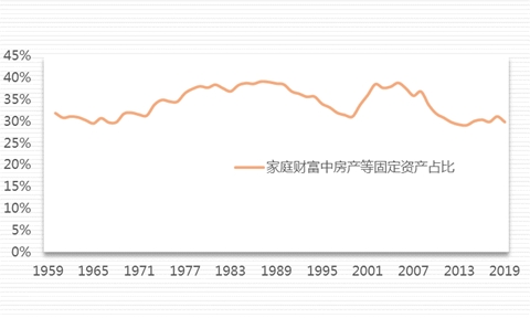 2、房产等固定资产占比长期稳定在35%左右,2008年以来受次贷危机影响处于低位