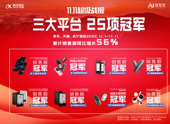 11月12日,科大讯飞发布”双11”战报,C端产品兑现AI红利实现可持续增长,一举斩获京东、天猫、苏宁易购三大平台25项冠军。11月1日至11月11日,销售额同比增长56% 。目前,科大讯飞消费者业务连续三年保持营收超过30%的增速,讯飞智能硬件产品体系也在逐步完善。