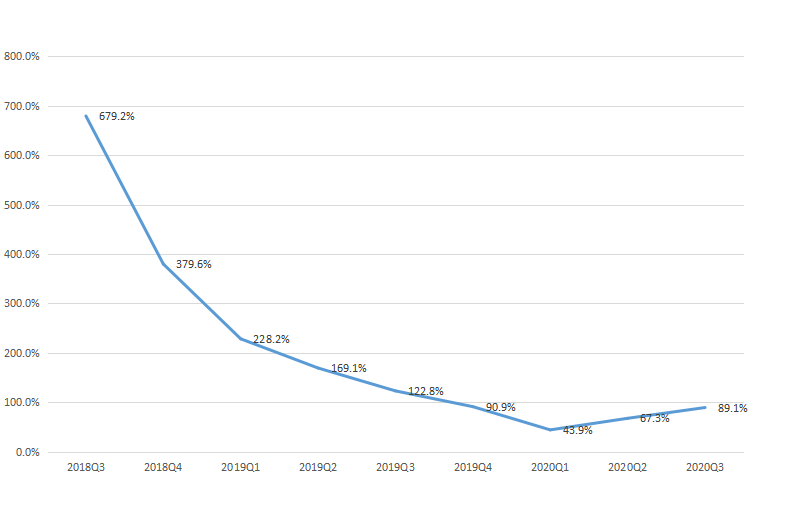 从GMV上看,拼多多三季度的年度GMV为14576亿元,同比增长73.5%,低于去年同期143.7%的增速;营业收入142.1亿元,同比增长89.11%,和去年122.84%相比差距显著;ARPU(每个用户的收入)上看,同比增长27.2%,去年同期数据为75.2%。
