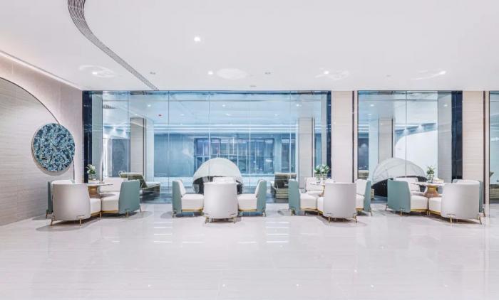 真我会客厅以水的概念展开,在水滴、泡沫、涟漪、波浪等视觉元素之间交互穿插,巧妙运用圆形的点、线、面元素产生层次变换的整体空间,一楼主要为休息区。