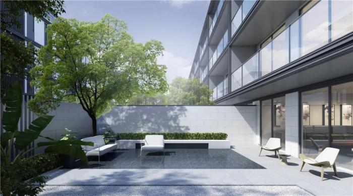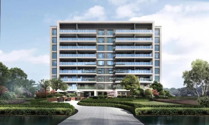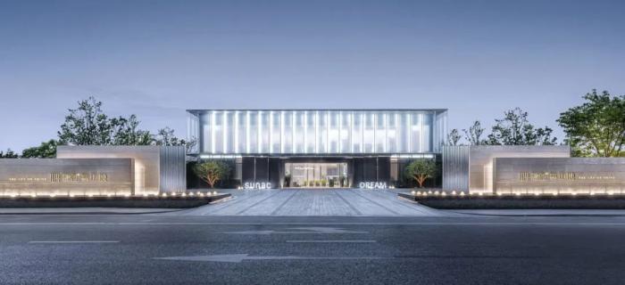 融创惠山映的外立面为宽幕落地玻璃窗,凸显了高级灰的美感。这种极简式风格大量利用玻璃元素来化解建筑内外的界限,将自然和光引入室内。