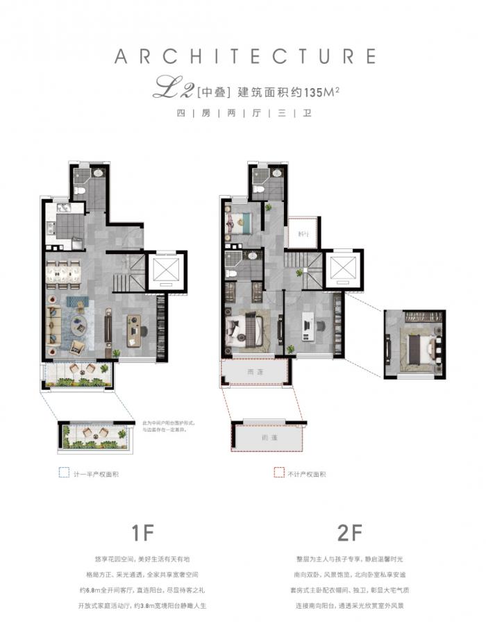 建筑面积约135㎡、150㎡的下叠都带有约50㎡的院子,这个我疯狂喜欢!可以种植许多绿植,也可以让孩子满院跑,在钢筋水泥的城市中,拥有一个属于自己的院子,是一件多么幸福的事啊。