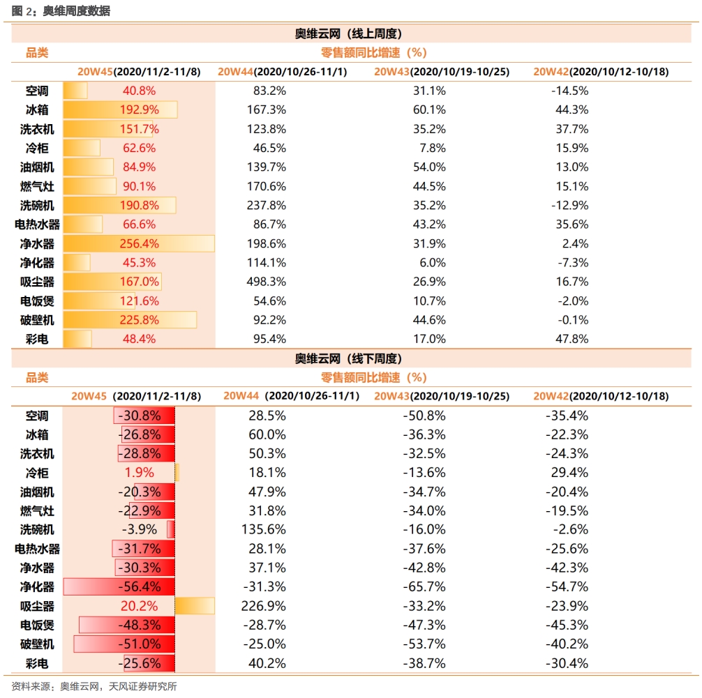 W45周度数据显示,线上方面受益于双十一第一阶段成交以及预售的红利,线上家电品类继续高速增长。其中冰箱、洗衣机、洗碗机、净水器、吸尘器、电饭煲和破壁机销额增速均超过100%。由于第一波预售增势较强,部分品类环比增速略有放缓,其中吸尘器环比增速下降331.3%,环比降幅最显著。线下大部分品类销售额同比有大幅下降,除吸尘器和冷柜同比增速为20.2%和1.9%外,其余均为负数。预计吸尘器品类线上增长惠及线下,其他品牌双十一线上优惠分散线下流量。