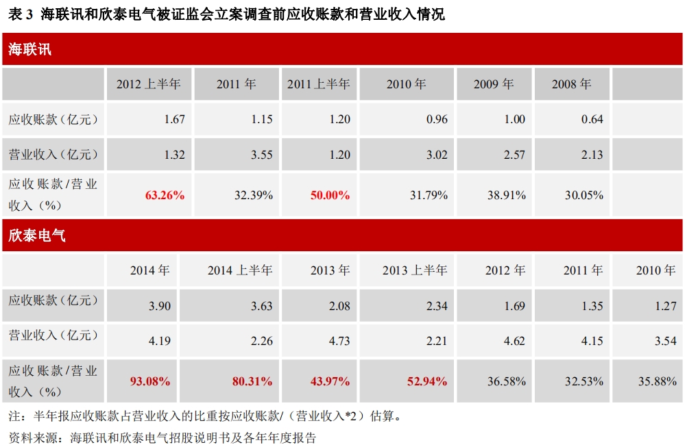 观察海联讯和欣泰电气的造假手法,共同特点在:期末伪造应收账款收回,下一会计期初再冲回。发现该造假迹象可以从应收账款占营业收入比重这一指标入手,可以观察应收账款占营业收入比重的年度变化和半年度变化,尤其是半年度数据和年度数据间的变化,因为这种造假操作一般发生在年末,以美化年度财务报告,所以很可能出现该指标半年度数据高,而年度数据低的情况。
