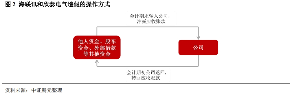 此类造假典型案例为海联讯和欣泰电气,两者的造假手段如出一辙。2013 年 3 月 21 日,海联讯接到证监会立案调查通知书,2014 年 11 月 6 日,收到《行政处罚和市场禁入事先告知书》。显示2009-2012年9月存在虚构收回应收账款的违法事实,例如:①2009 年 12 月 31 日,海联讯通过他人转入资金 1,429 万元冲减应收账款,后于 2010 年 1 月 4 日全额退款并转回应收账款;②2010 年 9 月和 12 月,海联讯通过股东垫资转入资金 2,566 万元冲减应收账款,2010 年 12 月,海联讯通过他人转入资金 8,754 万元冲减应收账款,后于 2011 年 1 月 4 日将他人资金8,754 万元全额退款并转回应收账款;③2011 年 6 月 30 日,海联讯通过他人转入资金 8,890 万元冲减应收账款,后于 2011 年 7 月 1 日全额退款并转回应收账款。