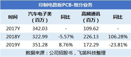 对此,公司解释,2019年,随着汽车产业结构调整的深入,行业优势企业顺势加速升级扩张,如星宇股份等核心客户的收入及业绩规模均实现较高增长。公司基于围绕汽车领域的长期发展战略,在产能总量受限的情况下,优先保障配合核心汽车客户升级扩张的战略需求,使得汽车电子PCB的收入在行业波动的环境下仍实现8.76%的同比增长,但短期内影响到高频通讯产品的排产和订单接收,因此高频通讯板收入有所下降。