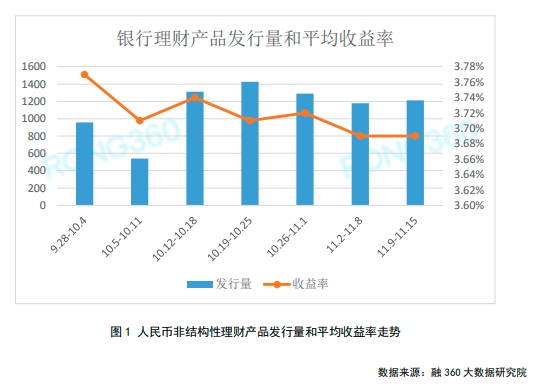 融360大数据研究院监测数据显示,上周(11月9日-11月15日)银行非结构性理财产品发行量共1214只,较前一周增加35只。