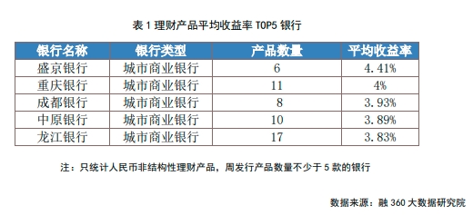 融360大数据研究院对各大银行的理财产品收益率进行排名(周发行量在5只及以上,不含外币理财和结构性理财),数据显示,上周盛京银行理财产品平均收益率为4.41%,排名首位,重庆银行产品平均收益率分别为4%,排名第二,成都银行产品平均收益率为3.93%,排名第三,中原银行、龙江银行平均收益率分别为3.89%、3.83%,分列第四、第五。