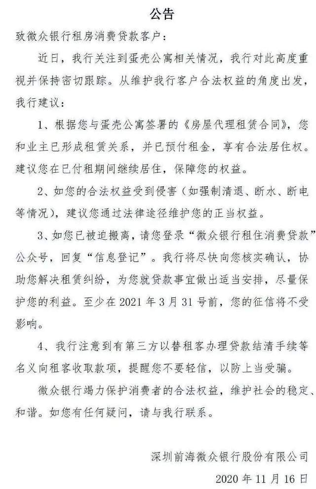 微众银行的一则公告暂时稳住了租客情绪,表示至少在2021年3月31日之前,租客不会因为蛋壳公寓租金贷影响征信。