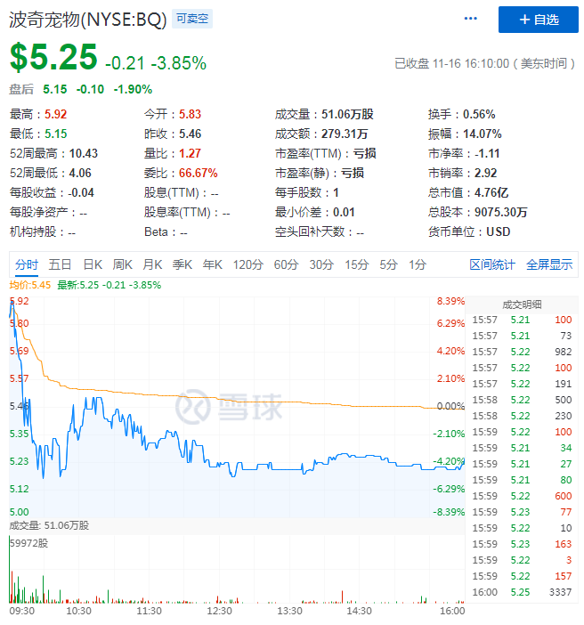 财报发布后,波奇宠物股价下跌1.90%,截止美股研究社发稿,波奇宠物每股报5.15美元,总市值为4.76亿美元。