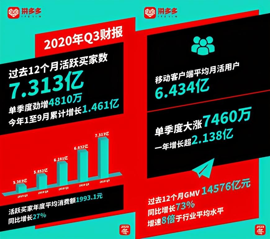 就在2020年11月12日,拼多多发布了截止9月30日的2020年第三季度财报。财报显示,拼多多2020年第三季度营收142.098亿元,同比增长89%。如果按照非美国通用会计准则(NON-GAAP)计算,拼多多三季度归属于普通股股东的净利润从去年同期的净亏损16.604亿元,大涨至正的4.664亿元,实现上市以来的首次单季度盈利。