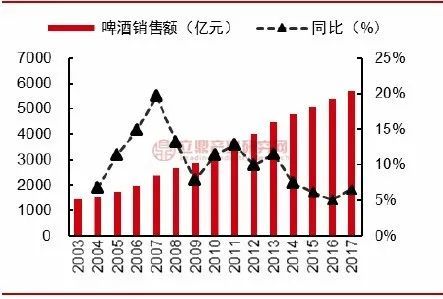 我们从数据上来看看国内啤酒行业的消费变化,根据中国国家统计局数据显示,中国啤酒销售额从2003年的约1500亿元,一路增长至2017年的约5500亿元。