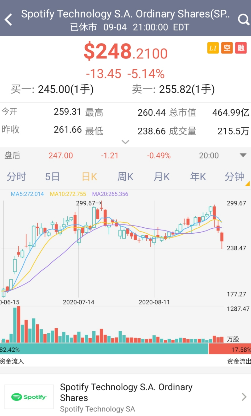 Spotify Technology S.A. Ordinary Shares(NYSE:SPOT)是一个起源于瑞典的音乐流服务,是全球最大的正版流音乐服务商。2008年10月在瑞典首都斯德哥尔摩正式上线,总部位于瑞典Stockholm,全职雇员4405人。Spotify提供包括SonyMusic、EMI、Warner Music Group和Universal Music Group四大唱片公司及众多独立厂牌所授权、由数字版权管理(DRM)保护的音乐。