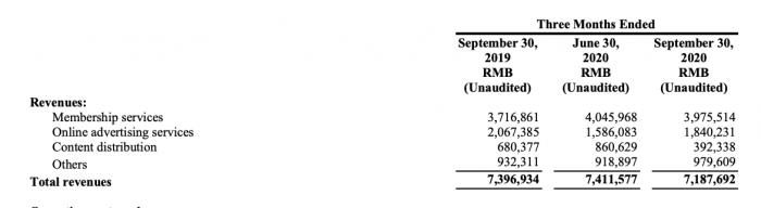 11月17日,爱奇艺发布了截至9月30日的2020财年第三季度未经审计财报。财报显示 ,爱奇艺第三季度总营收为人民币72亿元(约合11亿美元),同比下降3%;净亏损为人民币12亿元(约合1.730亿美元),相比之下去年同期的净亏损为人民币37亿元,同比大幅收窄。