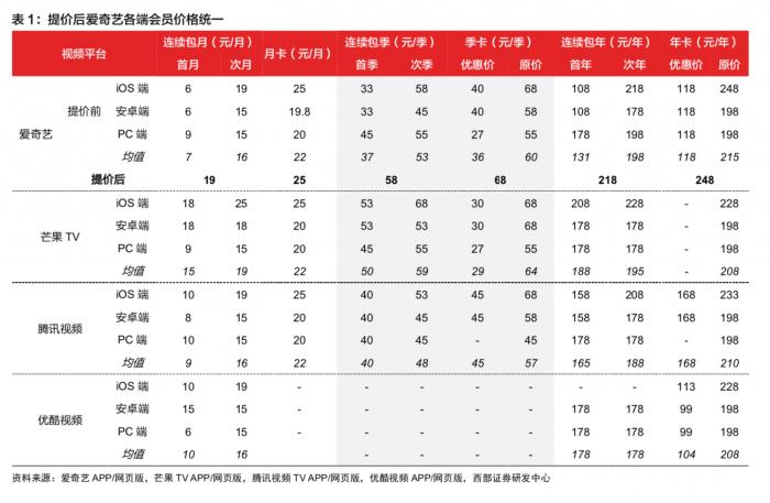 这一价格领先于全行业,但实际涨幅有限。以往视频会员通过iOS端付费的价格一般会高于通过安卓端/PC端付费的价格,本次爱奇艺价格调整为多端统一定价。对比提价前后的价格,iOS端基本持平,安卓端/PC端各档会员费用涨价约25%。